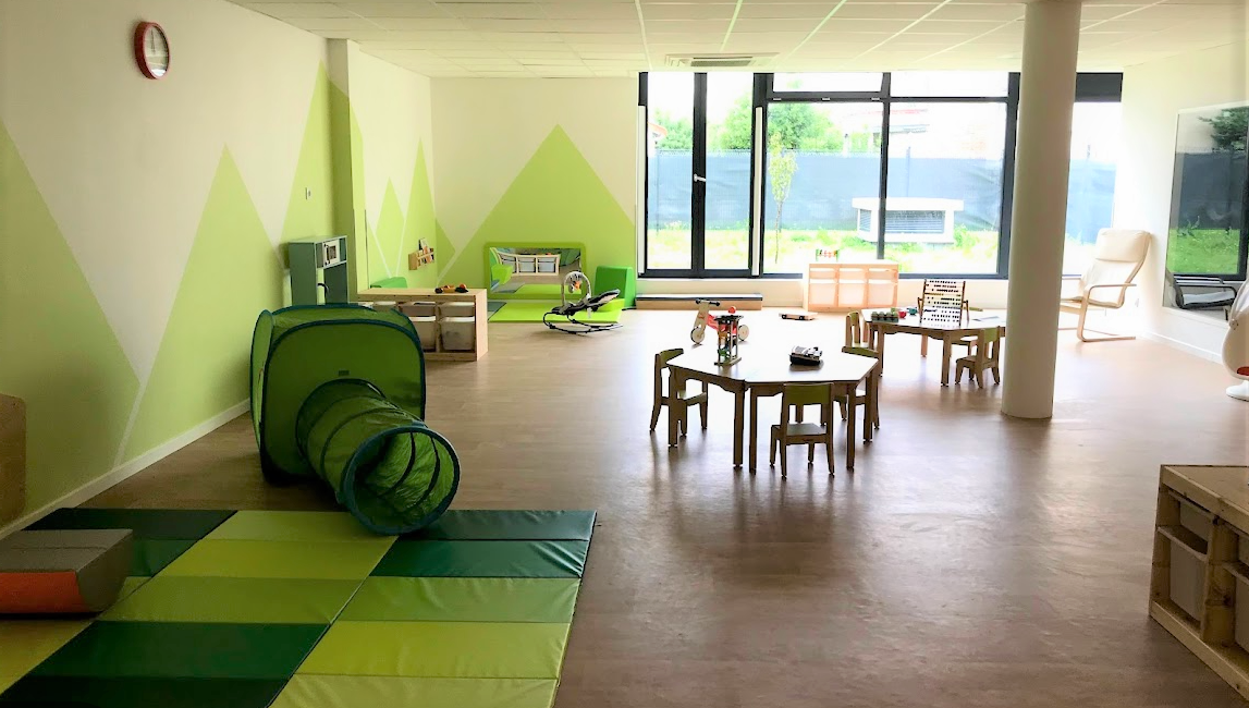 La micro-crèche de plus de 180 m² offre une salle de vie géante de 75 m² équipée d'une structure de motricité fixe, deux salles de sieste et un grand jardin avec terrasse, le tout organisé autour de lumineuses baies vitrées.