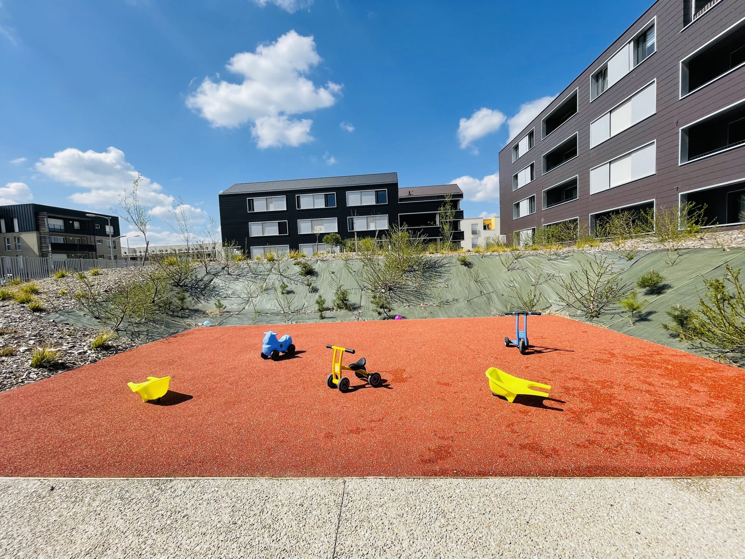 La micro-crèche offre aux enfants un espace extérieur sécurisé équipé d’un sol souple.