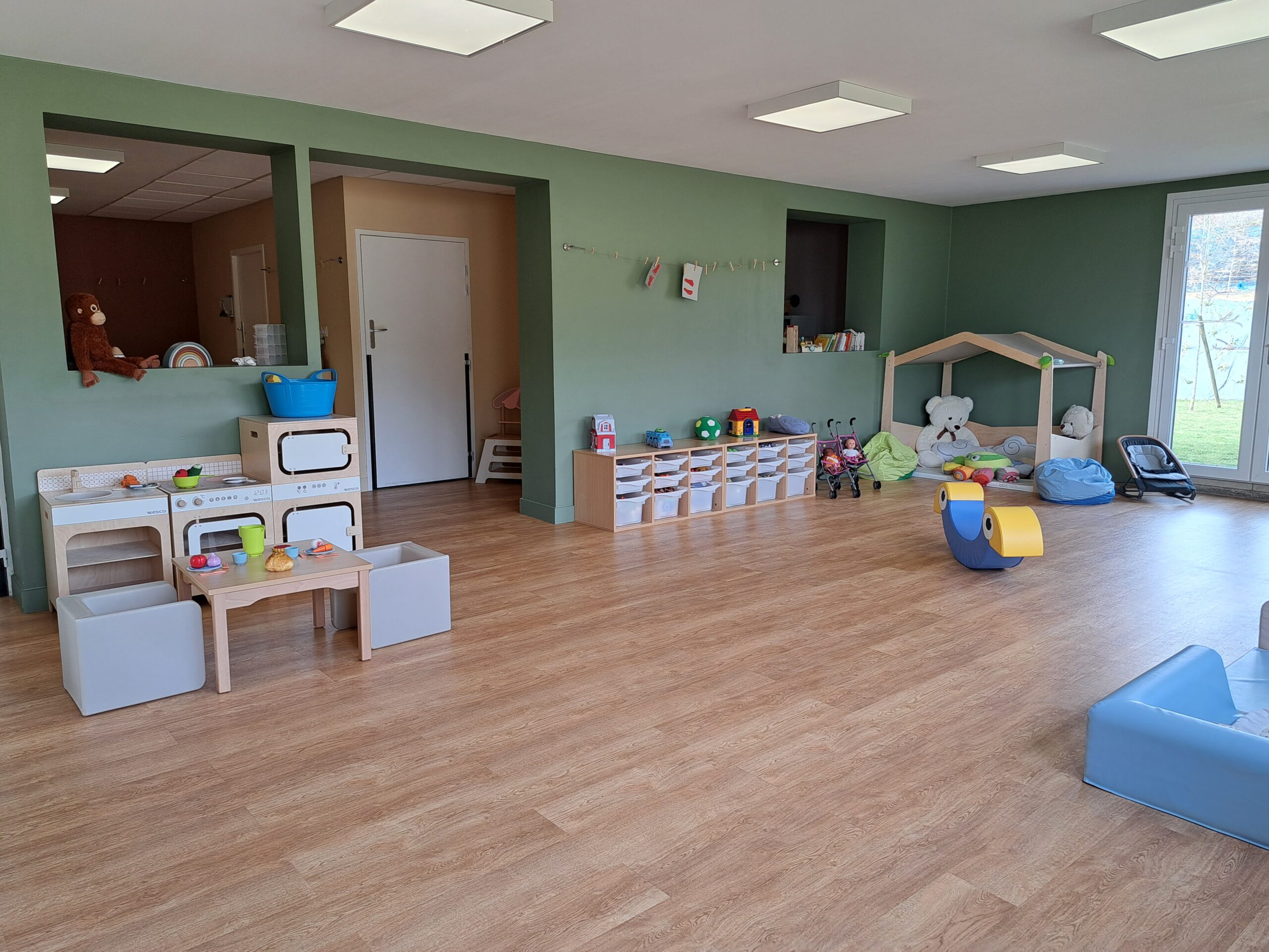 L’environnement harmonieux et fonctionnel favorise une libre motricité de l’enfant : jeux à hauteur et à disposition, espace cocoon semi ouvert pour les plus petits, mobilier adapté.