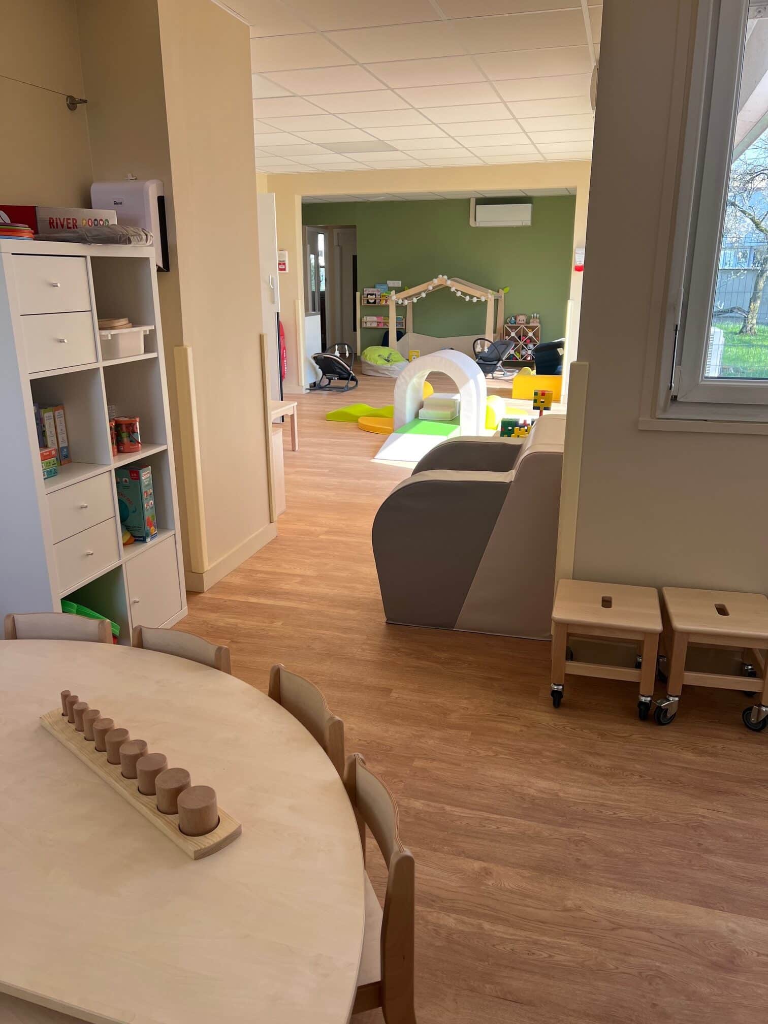 L’environnement harmonieux et fonctionnel favorise une libre motricité de l’enfant : jeux à hauteur et à disposition, espace cocoon semi ouvert pour les plus petits, mobilier adapté.